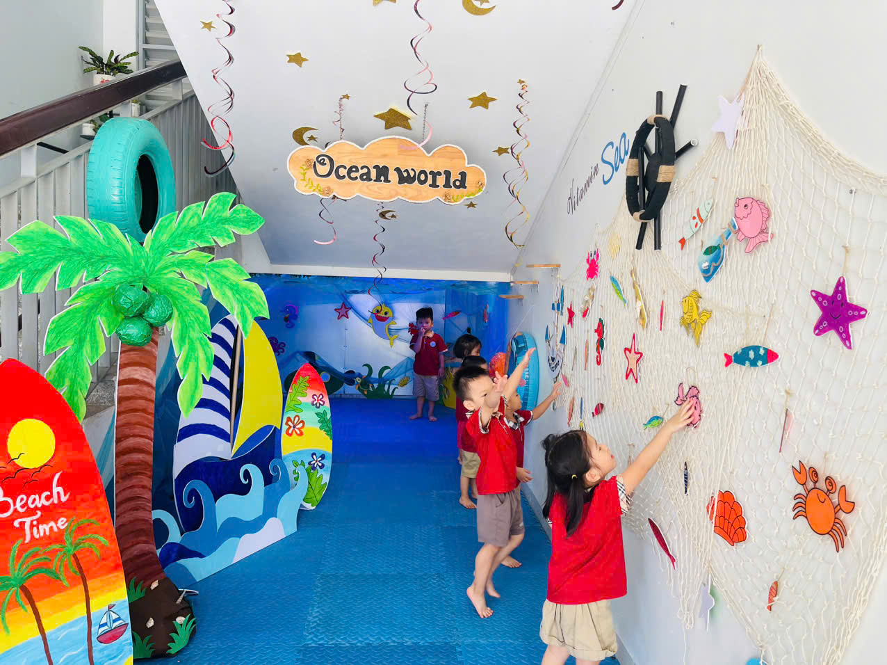 Đại dương xanh vô tận có rất nhiều điều lí thú để các con khám phá. Bé được tìm hiểu về đại dương - một thế giới đầy bí ẩn và lí thú, là ngôi nhà sinh sống của hàng trăm nghìn sinh vật khác nhau như: cá, cua, tôm, bạch tuộc, mực...Sự diệu kỳ của đại dương với sự đa dạng về loại sinh vật, động vật, về hình dáng màu sắc khác nhau, về cách sinh sản,...đã kích thích trí tò mò và sáng tạo của các bé. Ngày hôm nay, các con được khám phá chúng trong góc chơi Ocean world của trường. Trẻ vô cùng thích thú và hòa mình vào đại dương với những con vật ngộ nghĩnh đáng yêu.