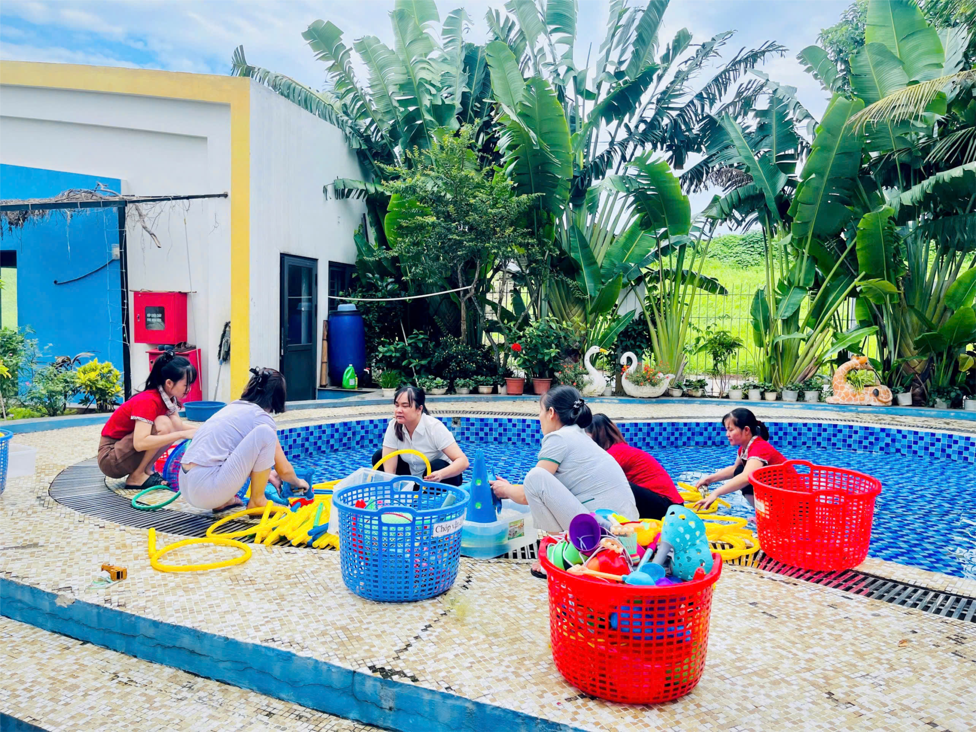 Nhằm đảm bảo môi trường học tập an toàn, sạch sẽ cho trẻ, đồng thời chủ động trong công tác phòng, chống dịch bệnh, đặc biệt là dịch sốt xuất huyết đang có nguy cơ gia tăng trong mùa mưa. Buổi ra quân diễn ra trong không khí khẩn trương, tích cực và đầy tinh thần trách nhiệm. Các khu vực như lớp học, sân chơi, nhà vệ sinh, bếp ăn, kho chứa đồ, khu vực chứa rác, cống rãnh… đều được vệ sinh kỹ lưỡng. Đặc biệt, công tác phát quang bụi rậm, diệt lăng quăng/bọ gậy, kiểm tra các vật dụng chứa nước có nguy cơ phát sinh muỗi vằn – trung gian truyền bệnh sốt xuất huyết – được chú trọng và thực hiện nghiêm túc.