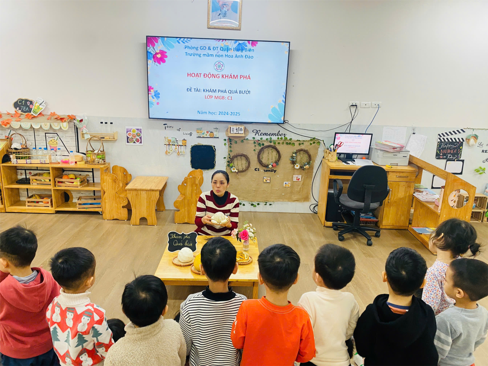 🎋 Hôm nay, Các bạn nhỏ lớp MGB C1 được khám phá và tìm hiểu về quả bưởi. Các con không chỉ được nhìn thấy quả bưởi trực tiếp mà các con còn được chạm tay vào quả bưởi thật và cùng thưởng thức những múi bưởi thơm ngon, tươi mát và rất ngọt nữa.