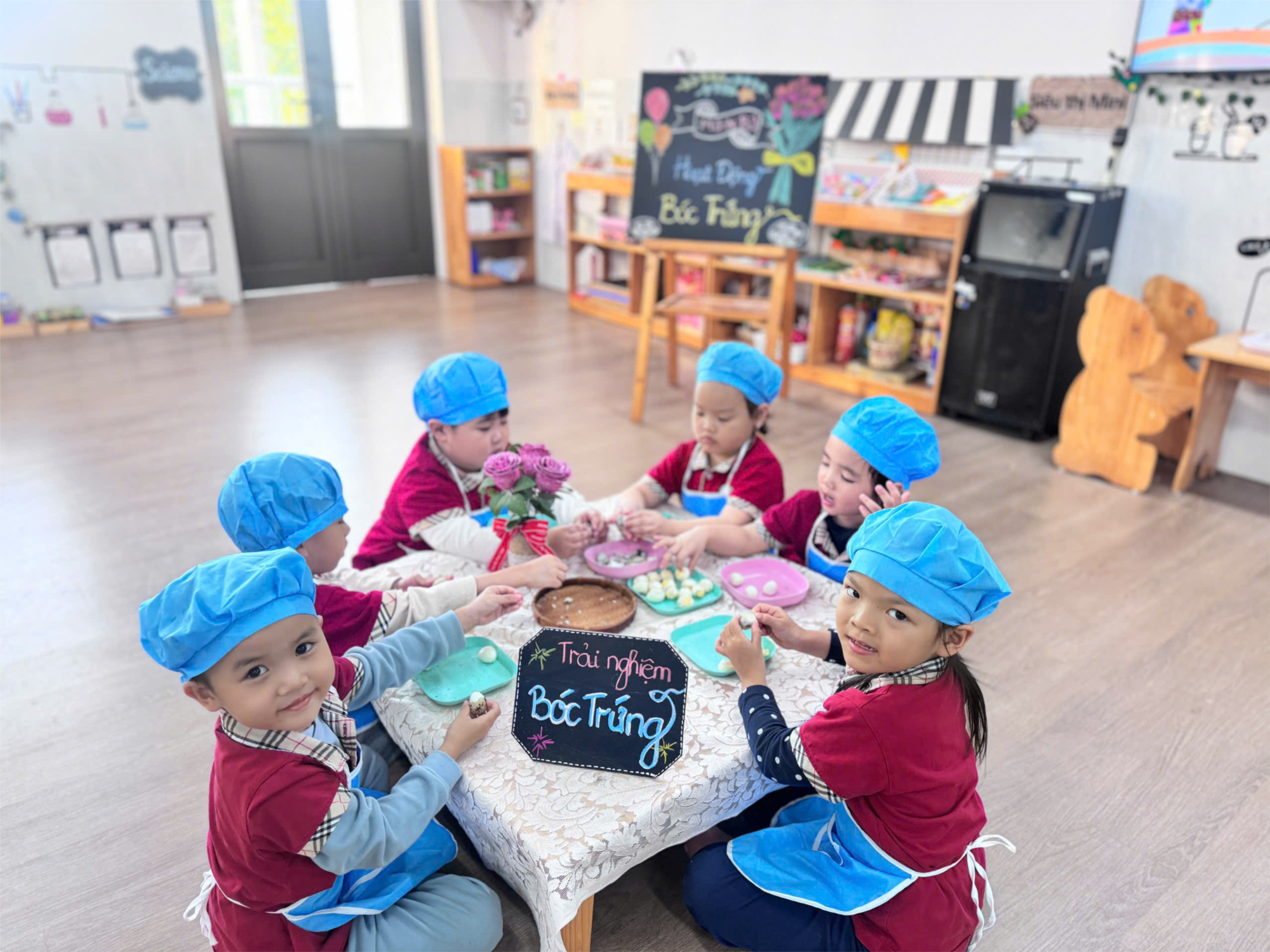 Hoạt động trải nghiệm “Bóc trứng cút” của các bạn nhỏ lớp Mẫu giáo nhỡ B3