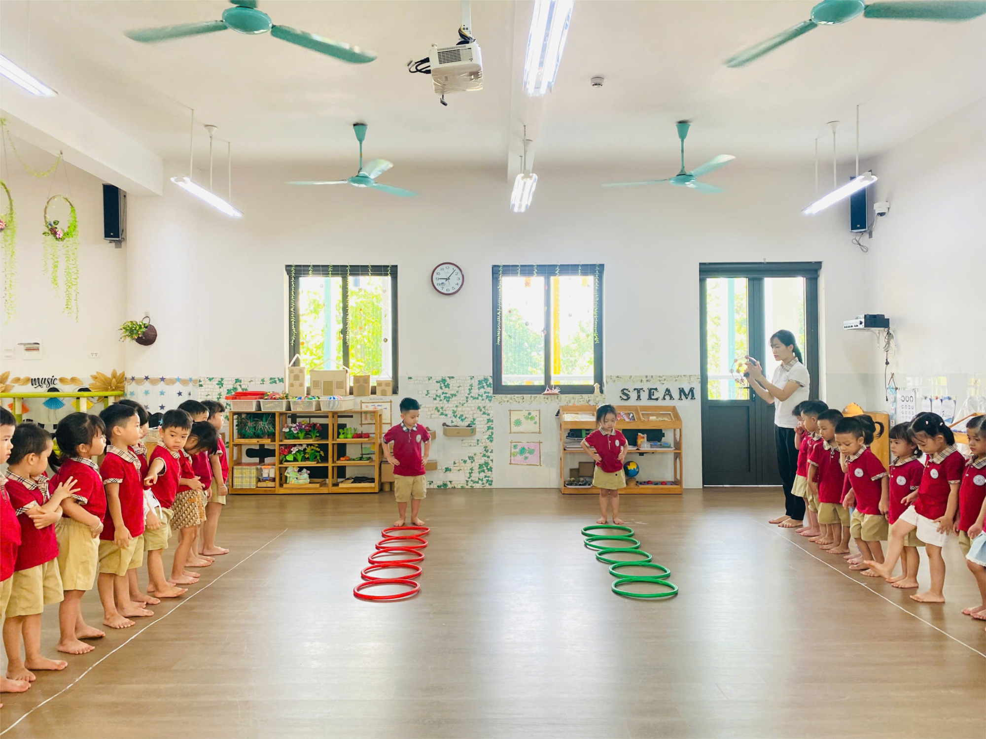 Thể dục có vai trò rất quan trọng với sự phát triển của trẻ, nhất là trẻ ở lứa tuổi mầm non. Tập thể dục sẽ nâng cao hoạt động của các cơ quan trong cơ thể để trẻ phát triển khỏe mạnh, hài hòa và cân đối, tạp cơ sở cho sự phát triển toàn diện của trẻ. Đến với giờ học thể dục: “ Bật liên tục về phía trước” của các bé lớp B1, các bé được rèn sự khéo léo, kĩ thuật chính xác khả năng tập trung, và tinh thần đoàn kết khi tham gia trò chơi vận động.