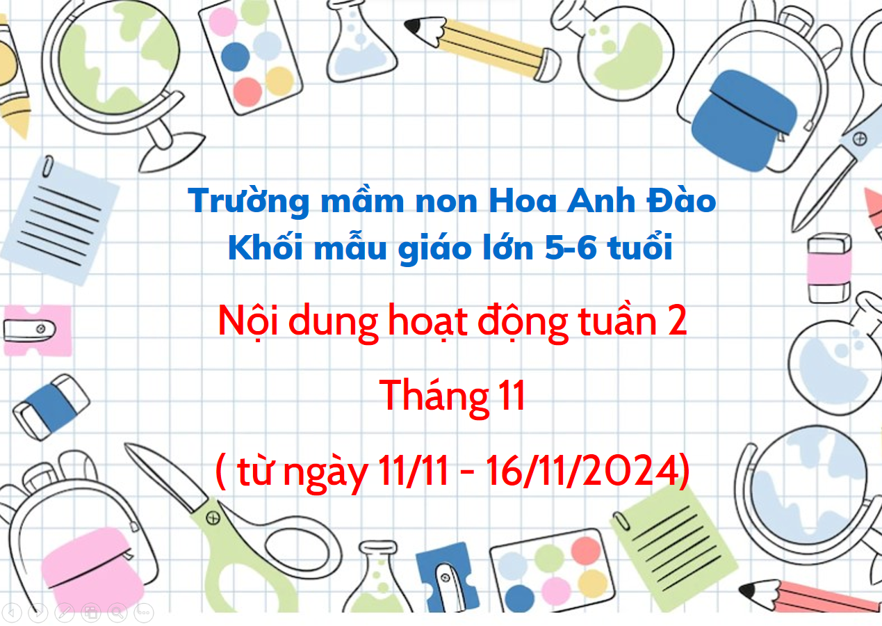| Dạy trẻ tách 7 đối tượng ra làm 2 phần bằng các cách khác nhau | Đan nong mốt hình cái túi (tiết mẫu) | Làm quen chữ cái u, ư | VĐCB: Lăn bóng dích dắc qua chướng ngại vật TCVĐ: Đá bóng vào gôn | Ngày nhà giáo Việt Nam 20/11 | Steam: Hạt muối diệu kỳ |