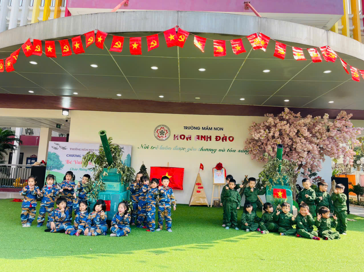 Hòa cùng không khí cả nước hướng tới kỷ niệm 80 năm ngày thành lập Quân đội nhân dân Việt Nam 22/12/1944 - 22/12/2024. Cô trò lớp B1 trường mầm non Hoa Anh Đào tổ chức các hoạt động kỷ niệm ngày thành lập quân đội nhân dân Việt Nam. Thông qua các hoạt động nhằm đẩy mạnh giáo dục kỹ năng sống và hoạt động giáo dục cho trẻ theo định hướng phát triển toàn diện phẩm chất và năng lực. Đồng thời giúp trẻ có tình cảm yêu thương nhiều hơn đối với người chiến sỹ quân đội nhân dân Việt nam, cô giáo đã tổ chức một số hoạt động sôi nổi chào mừng ngày lễ nhằm khơi dậy tình yêu, lòng tự hào về các chú bộ đội đang ngày đêm rèn luyện, chiến đấu để bảo vệ Tổ Quốc cho đất nước được bình yên, các cháu được vui chơi học tập. Khi trẻ được tham gia các hoạt động, trẻ được thể hiện tình cảm của mình với các chú bộ đội và thu hút được nhiều trẻ tham gia và các hoạt động học, hoạt động ngoài trời.