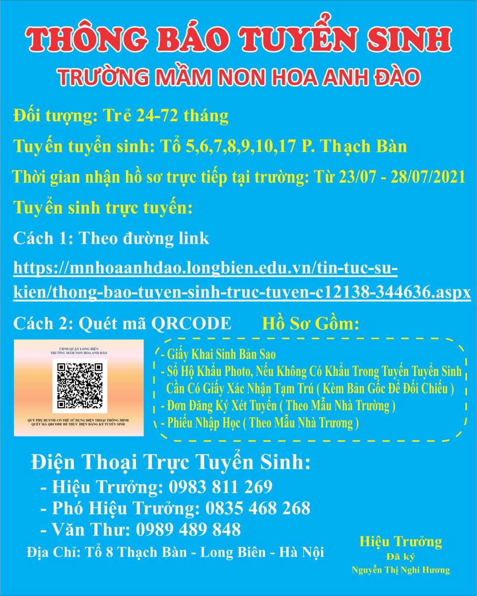 -Thực hiện Chỉ thị 17/CT-UBND ngày 23/7/2021 của UBND TP Hà Nội, trường Mầm non Hoa Anh Đào xin chuyển hình thức tuyển sinh trực tiếp bằng hình thức tuyển sinh trực tuyến.