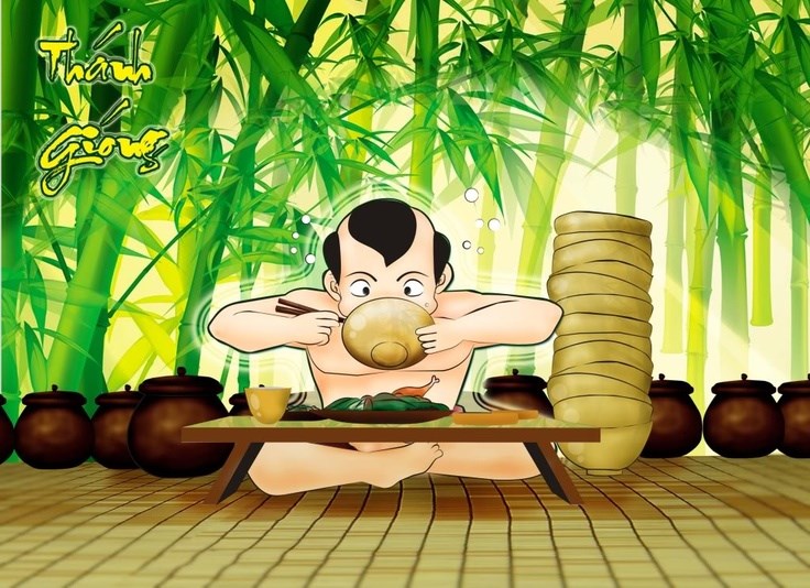 Càng lạ hơn nữa, sau hôm gặp sứ giả, chú bé lớn nhanh như thổi. Cơm ăn mấy cũng không no, áo vừa mặc xong đã căng đứt chỉ. Hai vợ chồng làm ra bao nhiêu cũng không đủ nuôi con, thành thử phải chạy nhờ bà con, hàng xóm. Bà con đều vui lòng gom góp gạo thóc nuôi chú bé, vì ai cũng mong chú giết giặc, cứu nước.
